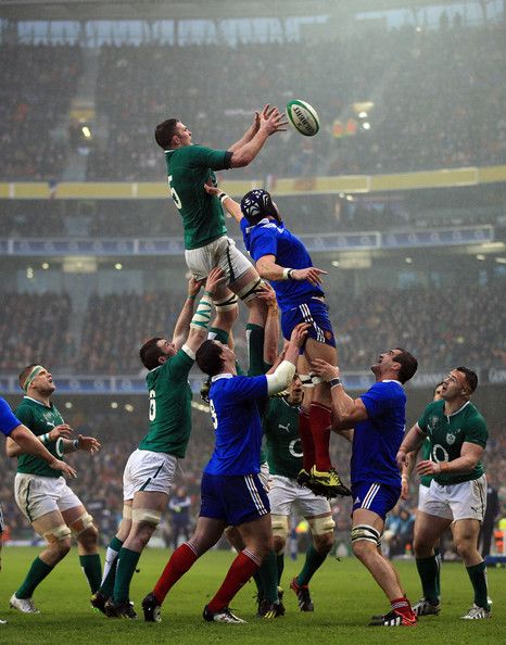 When the ball goes out of bounds, play restarts with a lineout. Players line up. The ball is thrown straight. Teammates lift players into the air.